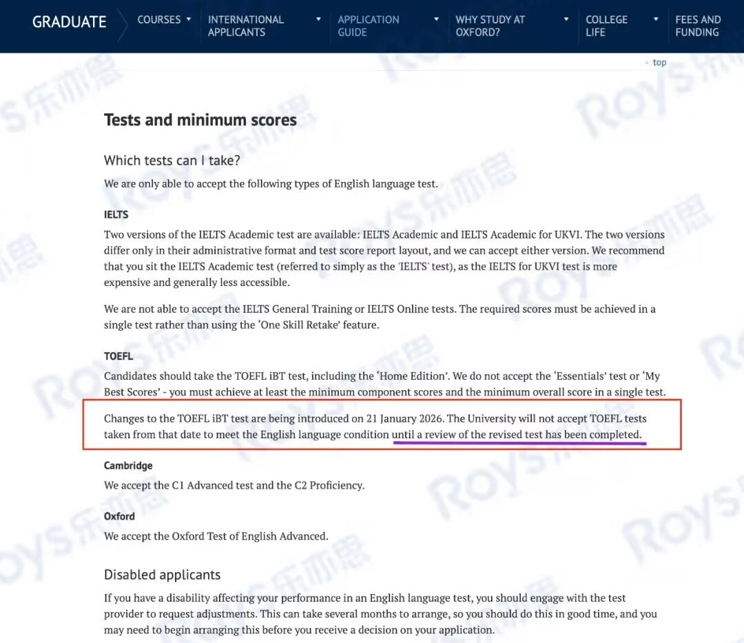 ??突發消息!留學圈又掀起波瀾!牛津大學官網最新發布,自2026年1月21日起,將不再接受新版TOEFL iBT成績作為研究生課程的語言能力證明。繼劍橋、格拉斯哥之后,牛津成為英國第三所明確“不接受”2026年新托福的頂尖高校。