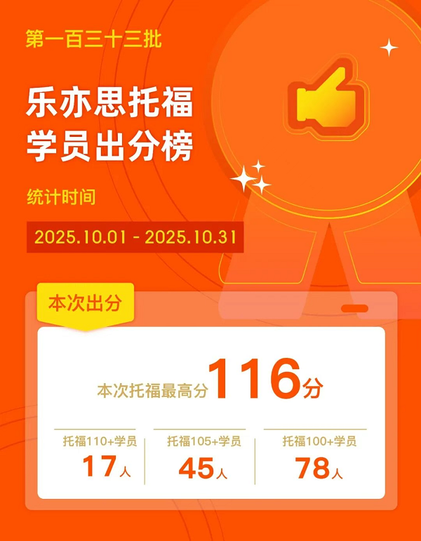近日,樂亦思托福再次傳來喜訊,高分學員如潮水般涌現!第133批出分榜新鮮出爐,最高分達到了驚人的116分!其中,托福110分以上的學員多達17人,105分以上的有45人,而100分以上的更是達到了78人!